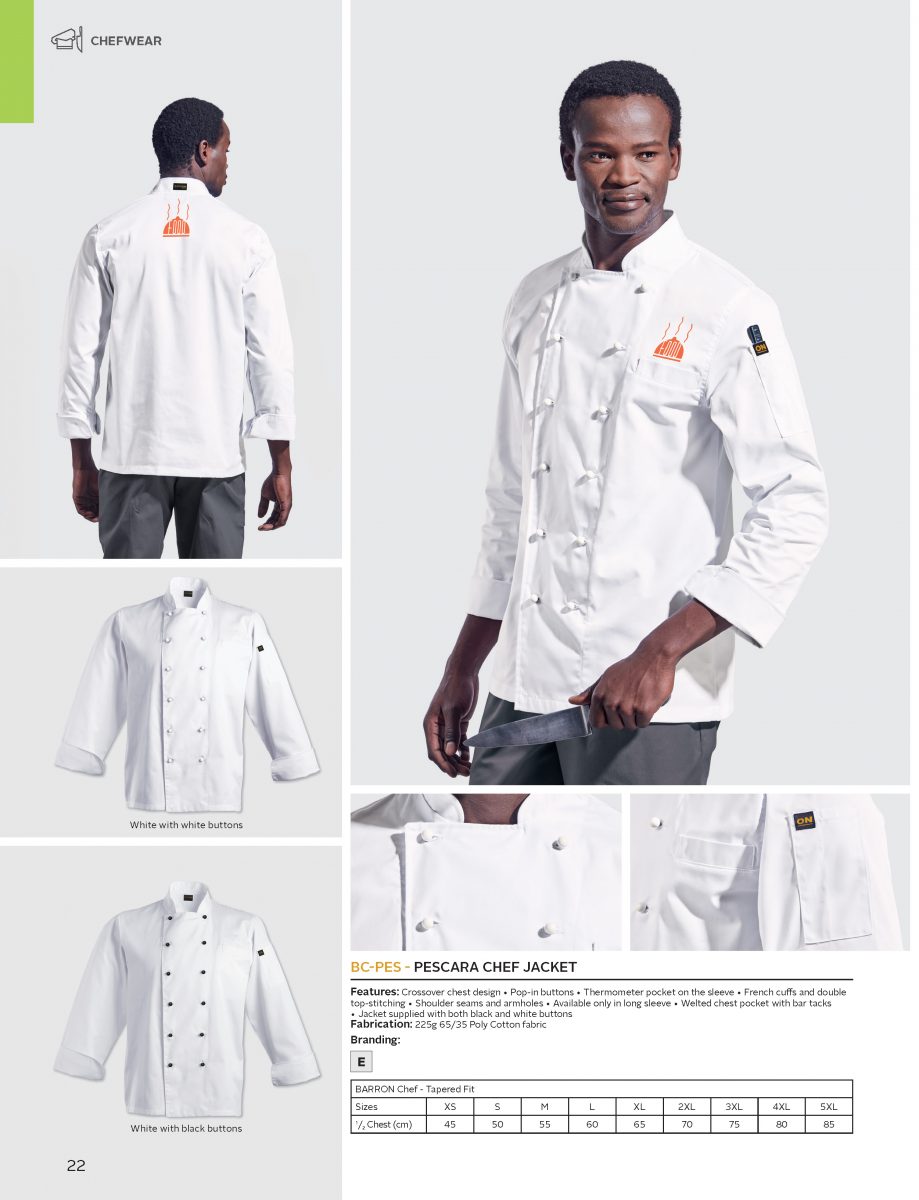 PESCARA CHEF JACKET EMBROIDERY Product price Additional options total: Order total: PESCARA CHEF JACKET quantity Add to basket Add to quote Related products VENETO CHEF JACKET SLATOR APRON CREW BIB APRON PROMO WAITERS APRON