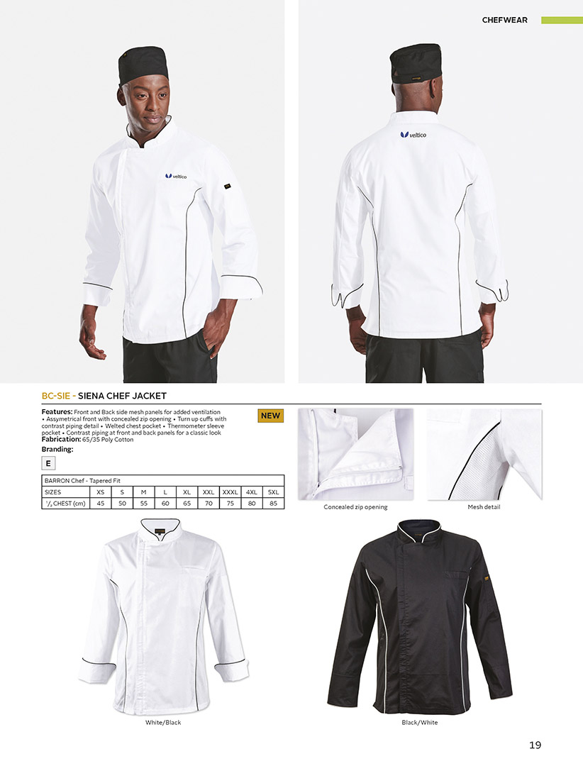 SIENA CHEF JACKET EMBROIDERY Colour WHITE/BLACK BLACK/WHITE Product price Additional options total: Order total: SIENA CHEF JACKET quantity Add to basket Add to quote Related products LADIES LONG SLEEVE SAVONA CHEF JACKET ROMA CHEF JACKET PESCARA CHEF JACKET KIDS TRICKLE BIB APRON